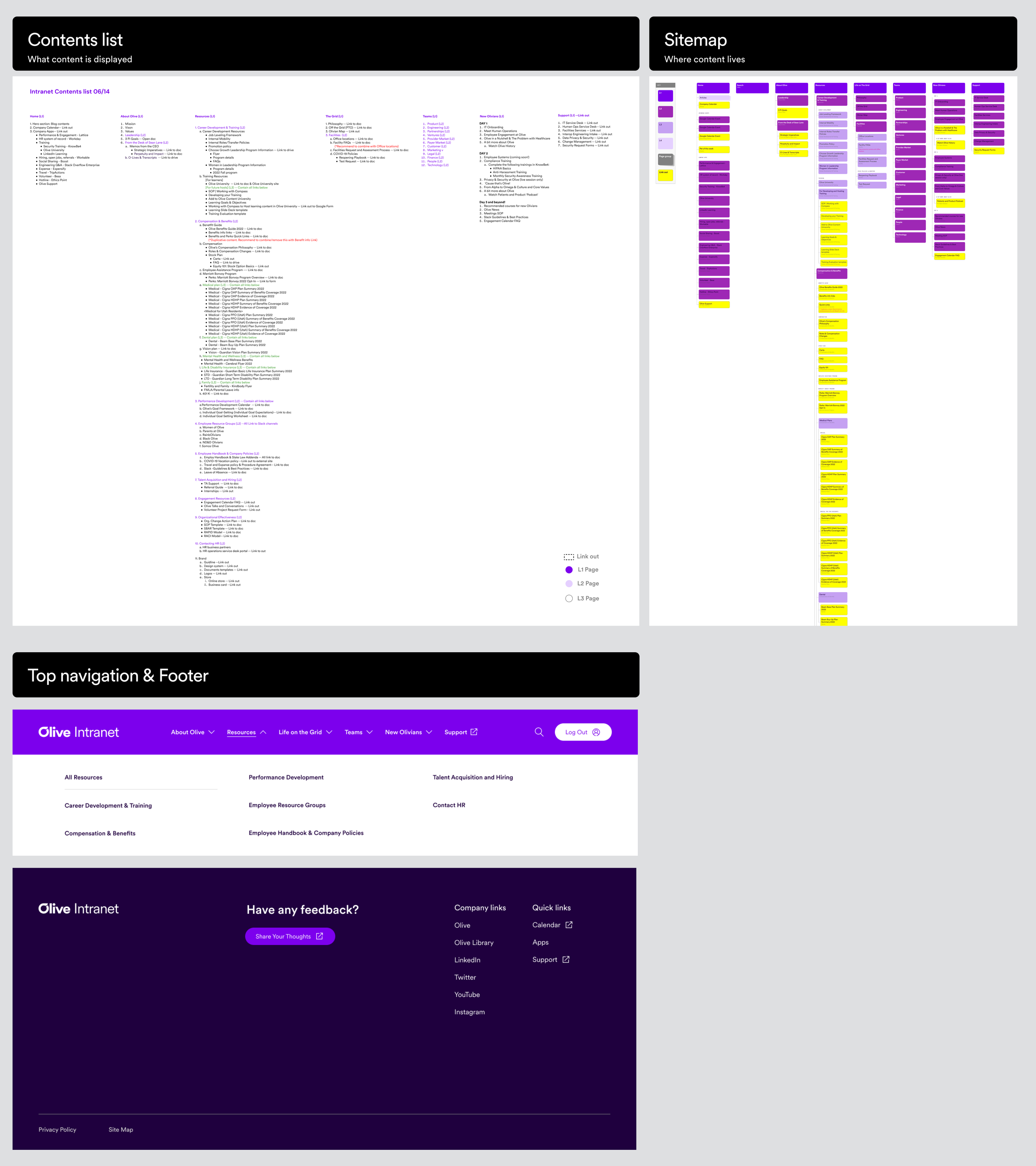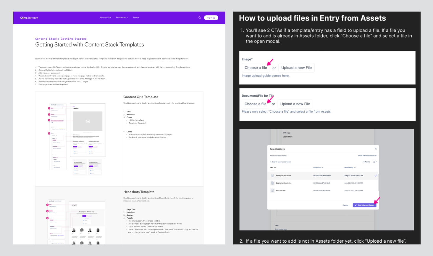 The intranet was built by Contentstack which is a content management platform that allows developers and content managers to create websites. I’ve set up all templates and page structures in Contentstack with easy and intuitive labels and titles, working closely with our dev team. We also wanted to help the content managers in Olive can easily manage the intranet. So I’ve created guidelines for using templates and step by step process of essential functionalities.