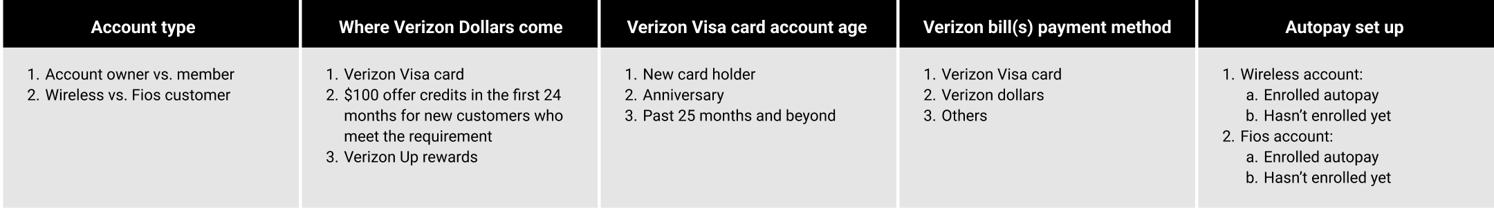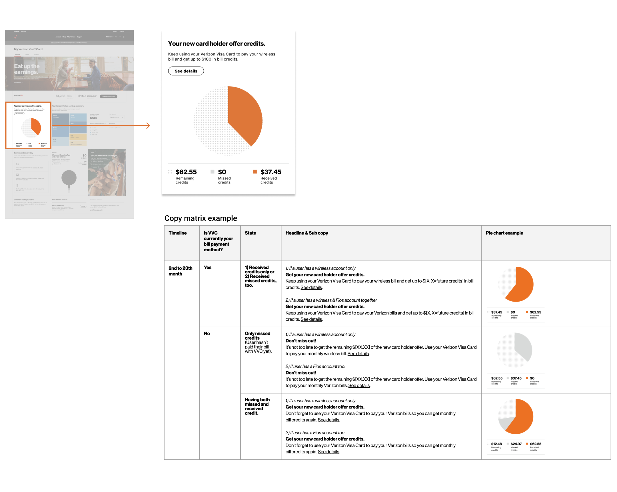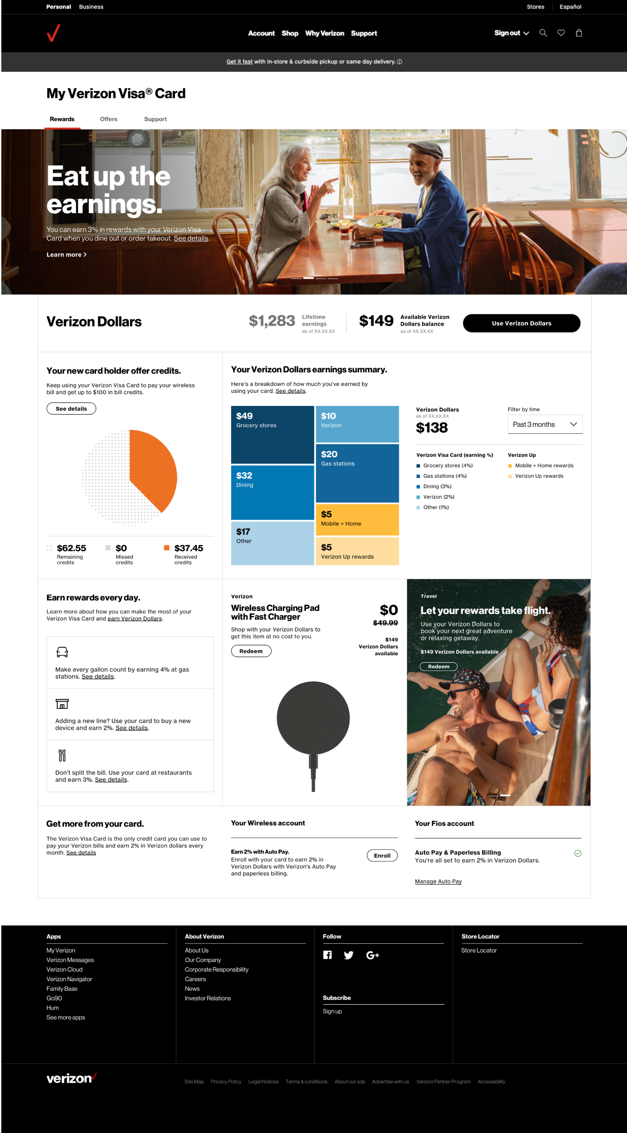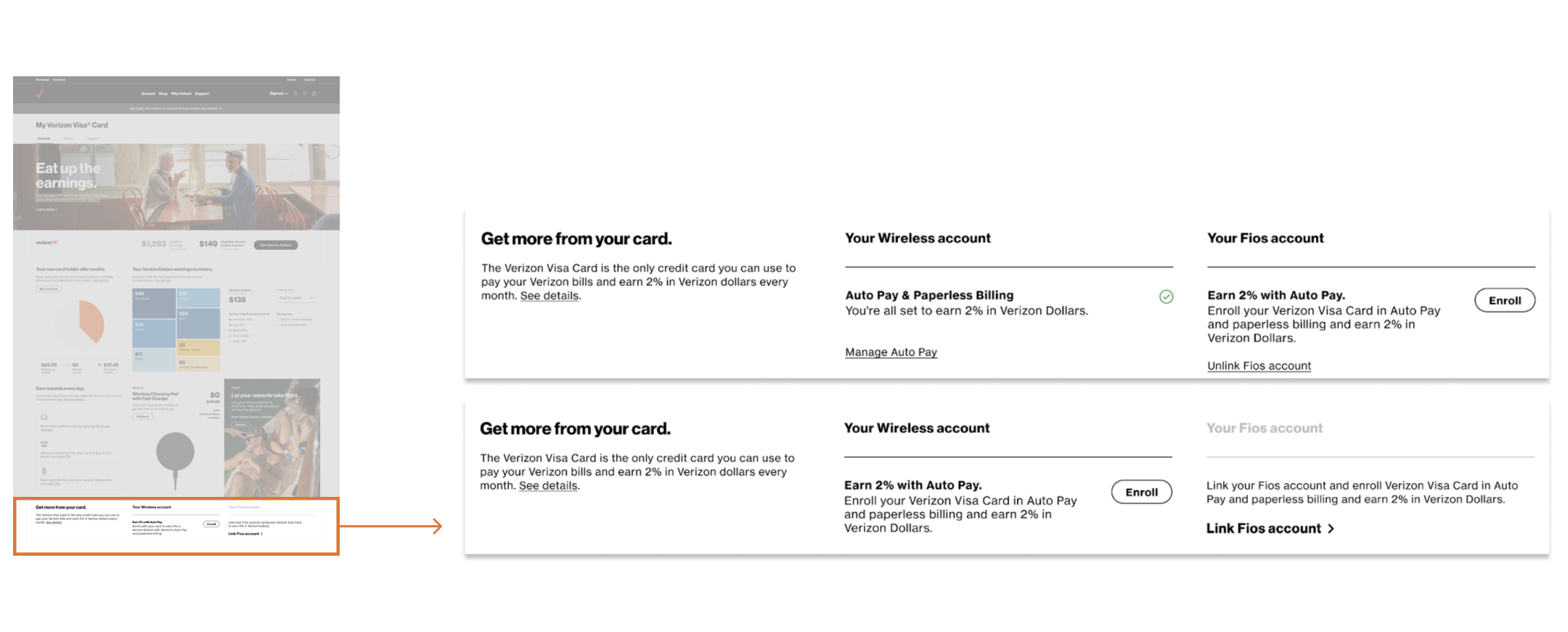 For those who haven't set up Verizon Visa card as their Verizon bill payment method, I showed missed credits to encourage enrollment. I also offered dynamic copy depending on earning states, collaborating with a copywriter.