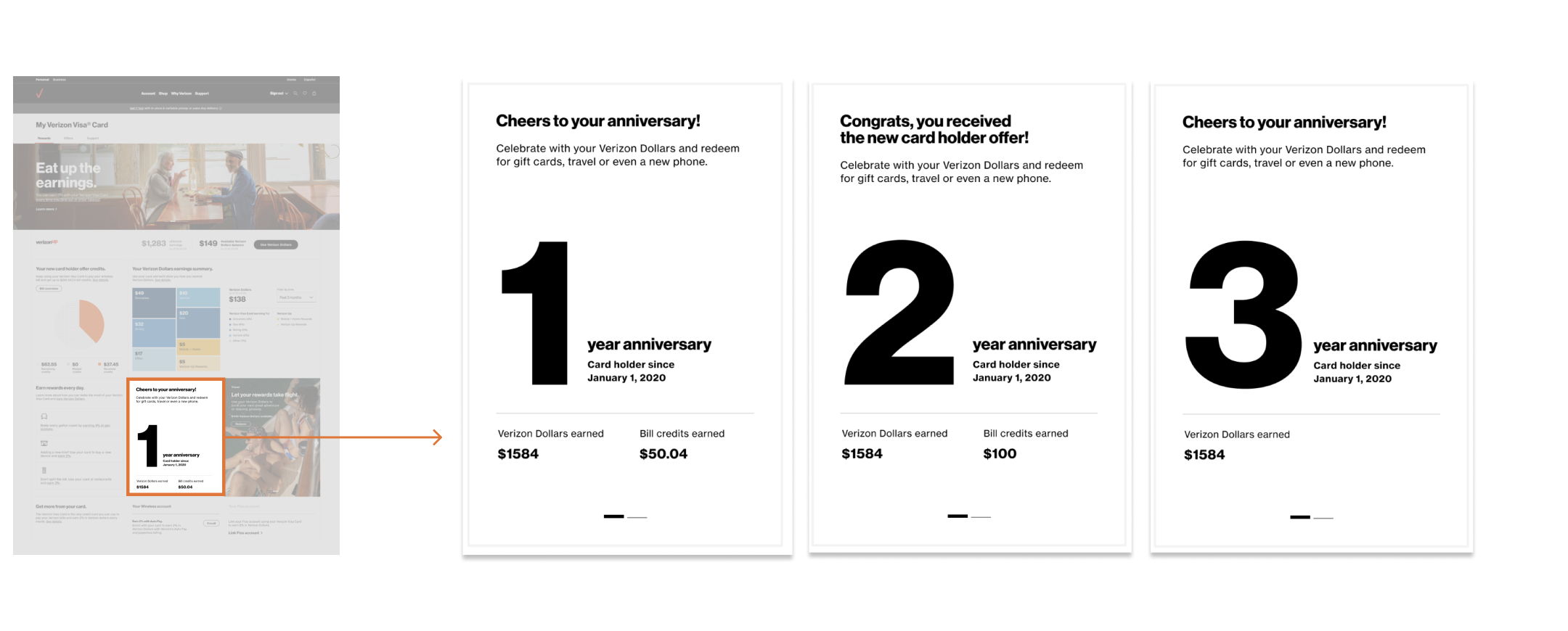 I aimed to foster a lasting emotional connection with customers to enhance their loyalty to the brand over time. A special anniversary banner will be showcased every year to show how long customers have made a relationship with Verizon. This banner will feature the cumulative Verizon Dollars and welcome credits that customers have accrued.