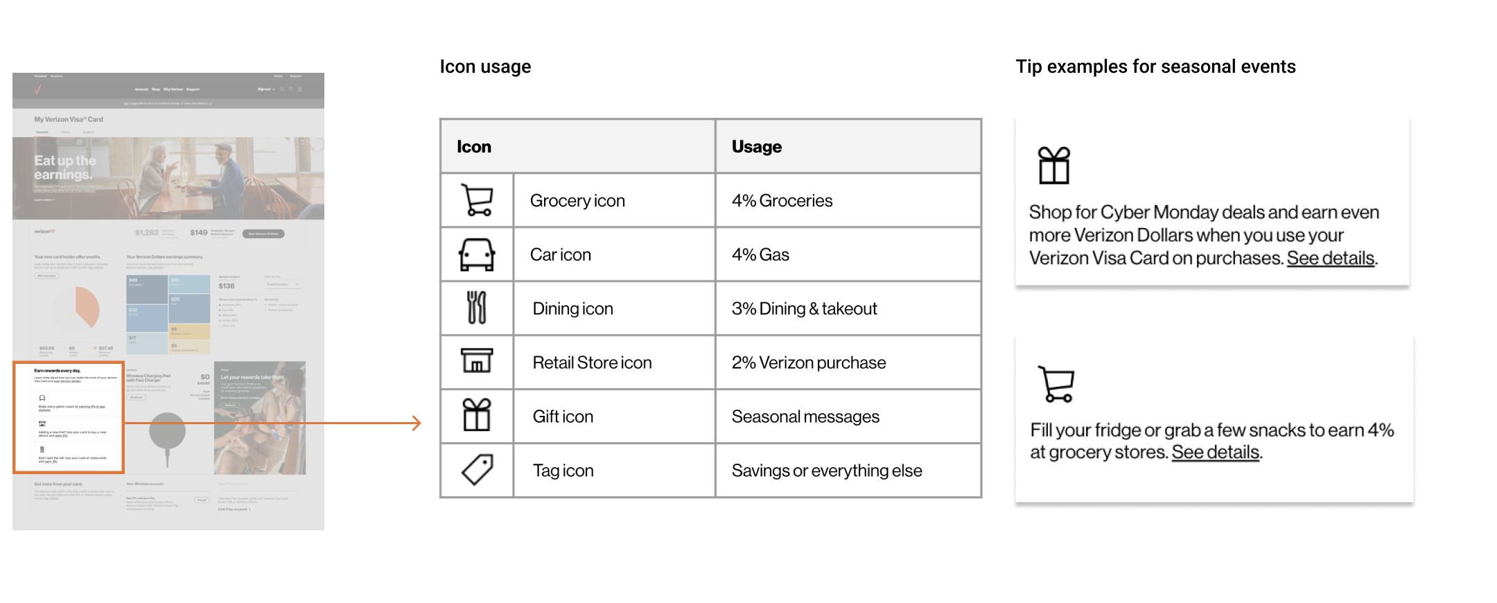 I've collaborated with a visual designer to define the usage of icons, intending to intuitively deliver various categories of earning tips. A total of 24 examples were furnished, incorporating seasonal copy to enhance clarity.